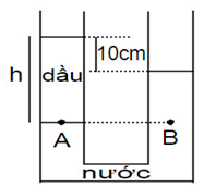 Một bình thông nhau chứa nước, người ta đổ dầu vào một nhánh, khi các chất lỏng đã đứng yên thì mặt thoáng ở hai nhánh chênh lệch nhau 10 cm. Biết trọng lượng riêng của nước và dầu lần lượt là 10 000 N/m3 và 8 000 N/m3. Độ cao của cột dầu là