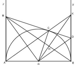 2) Cho nửa đường tròn \(\left( {O;R} \right)\) đường kính \(AB.\) Vẽ hai tiếp tuyến \(Ax,\,By\) với nửa đường tròn đó. Trên tia \(Ax\) lấy điểm \(M\) sao cho \(AM > R.\) Từ \(M\) kẻ tiếp tuyến \(MC\) với nửa đường tròn \(\left( O \right)\) (\(C\) là tiếp điểm). Tia \(MC\) cắt tia \(By\) tại \(D.\)