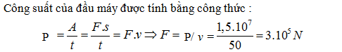 Một chiếc tàu hỏa chạy trên đường thẳng nằm ngang với vận tốc không đổi 50 m/s. Công suất của đầu máy là 1,5.104kW. Lực cản tổng cộng tác dụng lên tàu hỏa có độ lớn.