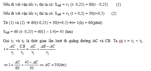 b) Để chuyển động từ A đến B theo đúng thời gian quy định t, xe chuyển động từ A đến C (C thuộc AB) với vận tốc không đổi = 60km/h rồi tiếp tục chuyển động từ C đến B với vận tốc không đổi =30km/h. Tìm AC.