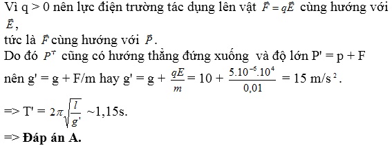 Một con lắc đơn có chiều dài dây treo 50 cm và vật nhỏ có khối lượng 0,01 kg mang điện tích q = + 5.10-6 C, được coi là điện tích điểm. Con lắc dao động điều hòa trong điện trường đều mà vectơ cường độ điện trường có độ lớn E = 104 V/m và hướng thẳng đứng xuống dưới. Lấy g = 10 m/s2, π = 3,14. Xác định chu kì dao động của con lắc.