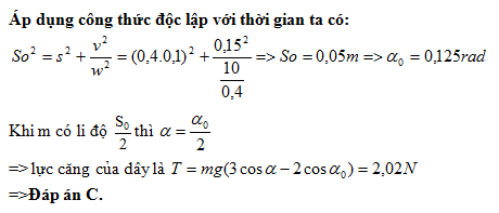 Một con lắc đơn có dây treo dài 0,4 m và vật nặng khối lượng m = 200 g, được treo thẳng đứng vào một giá cố định. Kéo vật m sang bên trái vị trí cân bằng để sợi dây tạo với phương thẳng đứng một góc α1= 0,1 rad rồi truyền cho vật vận tốc v1 = 0,15 m/s theo phương vuông góc với sợi dây hướng về vị trí cân bằng. Sau khi được truyền vận tốc, vật m dao động điều hòa với biên độ cong S0. Khi vật m có li độ