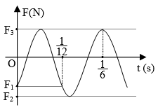 Một con lắc lò xo đang dao động điều hoà theo phương thẳng đứng. Chọn gốc toạ độ tại vị trí cân bằng, chiều dương hướng xuống dưới. Đồ thị biểu diễn sự phụ thuộc lực đàn hồi của lò xo vào thời gian được cho như hình vẽ. Biết \({F_1} + 2{F_2} + 7{F_3} = 0\). Tỉ số giữa thời gian lò xo bị giãn và thời gian lò xo bị nén trong một chu kì gần giá trị nào nhất sau đây?