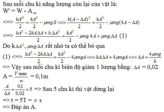Một con lắc lò xo dao động có m = 0,1kg, vmax = 1m/s. Biết k = 10N/m, μ = 0,05. Xác định thời gian để vật dừng hẳn?