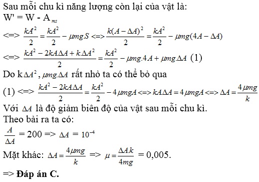 Một con lắc lò xo dđ tắt dần với biên độ ban đầu 2cm, sau 200dđ thì tắt hẳn. Biết vật có m = 300g và độ cứng k = 600N/m. Cho g = 10m/s2. Hệ số ma sát là