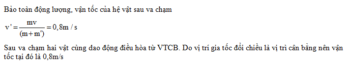 Một con lắc lò xo nằm ngang có độ cứng k = 100N/m, vật có khối lượng m1 = 200g. Hệ số ma sát giữa vật và mặt phẳng ngang là 0,01. Lấy g = 10m/s2. Khi vật m1 đứng yên tại vị trí lò xo không biến dạng thì một vật khối lượng m2 = 50g bay dọc theo phương của trục lò xo với vận tốc 4m/s đếm găm và gắn ngay vào m1 lúc t = 0. Độ lớn vận tốc của hai vật lúc gia tốc vừa đổi chiều lần thứ 2 kể từ thời điểm t = 0 là