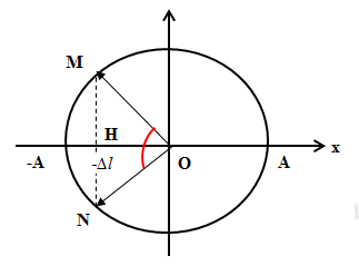 Xét ∆MOH có : \(\cos \widehat {MOH} = \dfrac{{OH}}{{OM}} \Leftrightarrow \cos \dfrac{\pi }{4} = \dfrac{{\Delta l}}{A} \Rightarrow A = \sqrt 2 .\Delta l\)