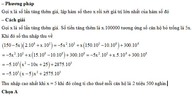 Một công ty bất động sản có 150 căn hộ cho thuê, biết rằng nếu cho thuê mỗi căn hộ với giá 2 triệu đồng mỗi tháng thì mọi căn hộ đều có người thuê và cứ mỗi lần tăng giá cho thuê mỗi căn hộ thêm 100.000 đồng mỗi tháng thì có stheem 5 căn hộ bị bỏ trống. Hỏi muốn có thu nhập cao nhất, công ty đó phải cho thuê mỗi căn hộ vao nhiêu đồng một tháng