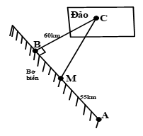 Phương án 3: Xây đường ống từ điểm A đến điểm B trên bờ biển, rồi xây đường ống từ điểm B đến điểm C trên hòn đảo. Biết: BC = 60km, AB = 100km, AM = 55km