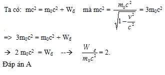 Một hạt có khối lượng nghỉ mo chuyển động với tốc độ v = c , với c là tốc độ ánh sáng trong chân không. Tỉ số giữa động năng và năng lượng nghỉ của hạt là: