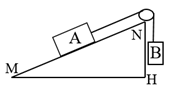 Một hệ ròng rọc, mặt phẳng nghiêng như trên hình vẽ. Hai vật A và B ở hình vẽ đứng yên. Cho biết \(MN = 120\,\,cm;\,\,NH = 30\,\,cm\). Tính tỉ số khối lượng của hai vật B và A? Biết rằng ma sát và khối lượng dây là không đáng kể.