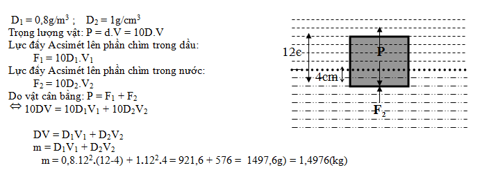 Một khối gỗ hình lập phương có cạnh 12cm nổi giữa mặt phân cách của dầu và nước, ngập hoàn toàn trong dầu, mặt dưới của hình lập phương thấp hơn mặt phân cách 4cm. Tìm khối lượng thỏi gỗ biết khối lượng riêng của dầu là 0,8g/cm3; của nước là 1g/cm3