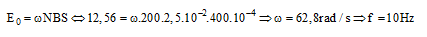 Một khung dây có N = 200 vòng, quay đều trong từ trường có cảm ứng từ B = 2,5.10-2(T). Trục quay vuông góc với véc tơ cảm ứng từ, diện tích mỗi vòng dây là S = 400cm2, suất điện động cực đại do khung tạo ra 12,56(V). Tần số của suất điện động cảm ứng: