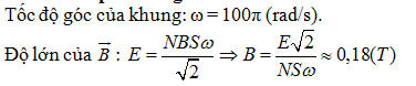 Một khung dây dẫn phẳng, hình chữ nhật, diện tích 100 cm2, gồm 500 vòng dây, quay đều với tốc độ 50 vòng/giây quanh một trục cố định ∆ trong từ trường đều có cảm ứng từ. Biết ∆ nằm trong mặt phẳng khung dây và vuông góc với . Suất điện động hiệu dụng trong khung là 200V. Độ lớn của gần với giá trị nào nhất: