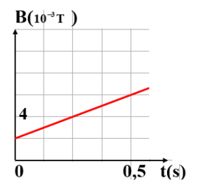 Một khung dây phẳng có diện tích 25cm2, gồm 10 vòng dây đặt trong từ trương đều, mặt phẳng vòng dây vuông góc với các đường sức từ. Hình bên là đồ thị biểu diễn sự phụ thuộc của cảm ứng từ B vào thời gian t. Độ lớn của suất điện động cảm ứng xuất hiện trong khung từ thời điểm t1 = 0 đến thời điểm t2 = 0,5s là