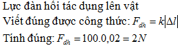 Một lò xo có độ cứng k=100 N/m treo thẳng đứng, đầu dưới có gắn vật nhẹ. Khi vật ở trạng thái cân bằng, lò xo dãn ra 2 cm. Tìm lực đàn hồi tác dụng vào vật
