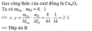 Một loại đồng oxit có thành phần gồm 8 phần khối lượng đồng và 1 phần khối lượng oxi. Công thức của oxít đó là:
