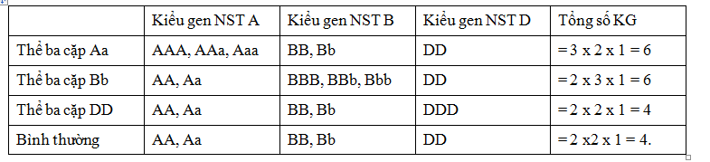 → Tổng số kiểu gen thể ba: 12 + 12 + 9 = 33 kiểu gen → III đúng.