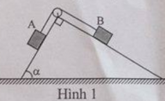 Một nêm có tiết diện tam giác vuông, Đặt trên mặt sàn nằm ngang. Hai vật A, B có cùng khối lượng m=0,5kg, được nối với nhau bằng một sợi dây không giãn vắt qua ròng rọc gắn ở đỉnh nêm (Hình 1). Biết khối lượng của nêm M = 1kg, góc \(\alpha ={{60}^{0}}\). Bỏ qua khối lượng ròng rọc, dây nối và ma sát ở ròng rọc. Lấy g=10m/s2.