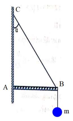 Một ngọn đèn khối lượng m = 4 kg được treo vào tường bởi dây BC và thanh AB (hình 2). Thanh AB gắn vào tường bằng bản lề A, \(\alpha ={{30}^{0}}\). Khối lượng của thanh AB là 2 kg. Tìm lực căng dây và phản lực do bản lề tác dụng lên thanh AB. Lấy g = 10 m/s2.