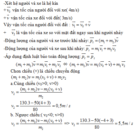 Một người có khối lượng m1=50kg nhảy từ một chiếc xe có khối lượng m2=80kg đang chuyển động theo phương ngang với vận tốc v=3m/s. Biết vận tốc nhảy đối với xe là v0=4m/s. Tính vận tốc sau khi người ấy nhảy