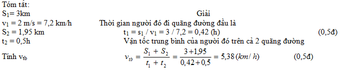 Một người đi bộ đều trên quãng đường đầu dài 3km với vận tốc 2 m/s. Ở quãng đường sau dài 1,95km người đó đi hết 0,5 giờ. Tính vận tốc trung bình của người đó trên cả hai quãng đường.