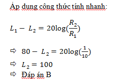 Một nguồn âm là nguồn điểm phát âm đẳng hướng trong không gian. Giả sử không có sự hấp thụ và phản xạ âm.Tại một điểm cách nguồn âm 10m thì mức cường độ âm là 80 dB. Tại điểm cách nguồn âm 1m thì mức cường độ âm là