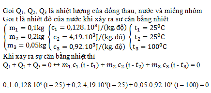 Một nhiệt lượng kế bằng đồng thau có khối lượng 100g chứa 200g nước ở nhiệt độ 250C. Người ta thả một miếng nhôm có khối lượng 50g đã nung nóng đến 1000C vào nhiệt lượng kế(hình vẽ 3). Xác định nhiệt độ t của nước khi xảy ra sự cân bằng nhiệt. Bỏ qua sự truyền nhiệt ra ngoài không khí. Cho biết nhiệt dung riêng của đồng thau là 0,128.103J/(kg.độ), nhiệt dung riêng của nước là 4,19.103J/(kg.độ) và nhiệt dung riêng của nhôm là 0,92.103J/(kg.độ)