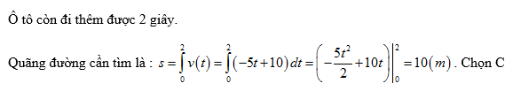 Một ô tô đang chạy với vận tốc 10m/s thì người lái đạp phanh; từ thời điểm đó, ô tô chuyển động chậm dần đều với vận tốc v(t) = –5t + 10 (m/s), trong đó t là khoảng thời gian tính bằng giây, kể từ lúc bắt đầu đạp phanh. Hỏi từ lúc đạp phanh đến khi dừng hẳn, ô tô còn di chuyển bao nhiêu mét?