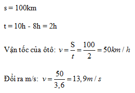 Một ô tô khởi hành từ Hà Nội lúc 8h, đến Hải Phòng lúc 10h. Cho biết đường Hà Nội - Hải Phòng dài 100km. Tính vận tốc của ô tô ra km/h, m/s ?