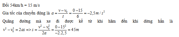 Một ôtô đang chuyển động với vận tốc 54km/h thì người lái xe hãm phanh. Ôtô chuyển động thẳng chậm dần đều và sau 6 giây thì dừng lại. Quãng đường s mà ôtô chạy thêm được kể từ lúc hãm phanh là :