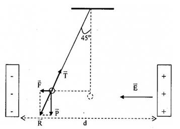 \(\begin{array}{l}\tan {45^0} = \frac{F}{P} \to F = P \leftrightarrow qE = mg \leftrightarrow q\frac{U}{d} = mg\\ \to U = \frac{{mg{\rm{d}}}}{q} = 200V\end{array}\)