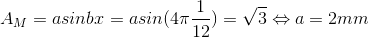 Một sóng dừng trên một sợi dây có dạng: y = a.sin(bx).cos(ωt), trong đó y là li độ dao động của một phần tử trên dây mà vị trí cân bằng của nó cách gốc toạ độ O một khoảng x; x đo bằng mét, t đo bằng giây. Biết bước sóng là 50 cm. Biên độ dao động của một phần tử cách một bụng sóng m 1/24 là
