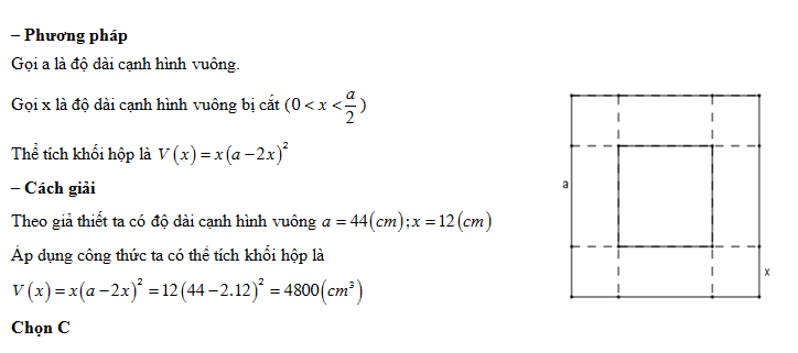 Một tấm bìa hình vuông có cạnh 44cm, người ta cắt bỏ đi ở mỗi góc tấm bìa một hình vuông cạnh 12cm rồi gấp lại thành một cái hộp hình chữ nhật không có nắp. Tính thể tích cái hộp này.