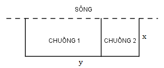 Một trang trại nuôi gia cầm muốn rào thành hai chuồng hình chữ nhật sát nhau và sát một con sông (như hình vẽ), một chuồng vịt và một chuồng ngan. Biết rằng trang trại đã có sẵn 240m hàng rào. Hỏi tổng diện tích lớn nhất của hai chuồng có thể là bao nhiêu?