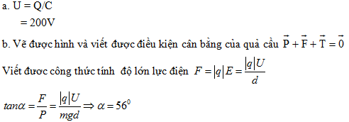 b. Một quả cầu kim loại có khối lượng m = 10g tích điện q = 3µC được treo bằng sợi dây nhẹ, không dãn, cách điện trong khoảng không gian giữa hai bản tụ. Xác định góc tạo bởi phương của dây treo và phương thẳng đứng khi quả cầu cân bằng? Lấy g = 10m/s2