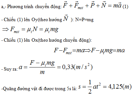 a) Nếu vật được kéo trượt trên mặt sàn nằm ngang bởi một lực theo phương ngang . Biết lực có độ lớn 100N. Tính quãng đường vật đi được sau 5 s.