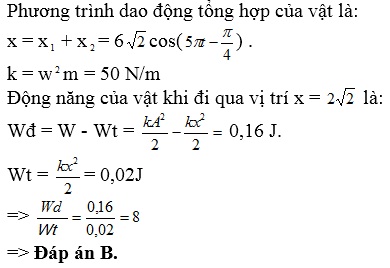 Một vật có khối lượng m = 200g, thực hiện đồng thời hai dao động điều hoà cùng phương, cùng tần số có phương trình: x1 = 6cos(5 πt – π/2)cm và x2 = 6cos5 πt cm. Lấy π2 =10. Tỉ số giữa động năng và thế năng tại x = 2 √2 cm bằng