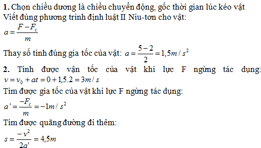 Sau khi vật chuyển động 2 s thì lực kéo F ngừng tác dụng lên vật. Tìm quãng đường vật đi thêm được từ khi lực F ngừng tác dụng đến khi vật dừng lại.
