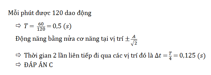 Một vật dao động điều hòa, cứ mỗi phút thực hiện được 120 dao động. Khoảng thời gian giữa 2 lần liên tiếp động năng bằng một nửa cơ năng của nó là: