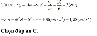 Một vật dao động điều hòa, gốc tọa độ ở vị trí cân bằng, vận tốc của vật có biểu thức v = 18cos(6t - π/6) cm/s. Gia tốc của vật có giá trị cực đại bằng