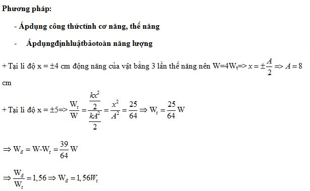 Một vật dao động điều hòa trên trục x. Tại li độ x = ±4 cm động năng của vật bằng 3 lần thế năng. Tại li độ x = ±5 cm thì động năng của vật bằng
