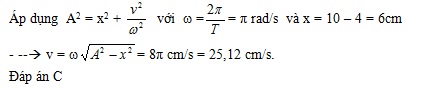 Một vật dao động điều hòa với chu kì 2 s, biên độ 10 cm. Khi cách vị trí biên 4 cm, tốc độ của vật bằng