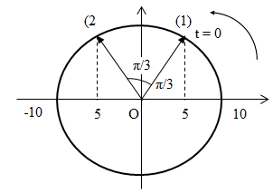 Trong 1T vật đi được quãng đường 40cm. Vật đi được quãng đường 10cm còn lại trong khoảng thời gian ∆t’ (tương ứng với chất điểm đi từ vị trí (1) đến vị trí (2) trên đường tròn lượng giác).