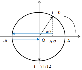 Góc quét được sau thời gian 7T/12 kể từ thời điểm ban đầu: \(\alpha = \omega .\Delta t = {{2\pi } \over T}.{{7T} \over {12}} = {{7\pi } \over 6} = {\pi \over 6} + \pi \)