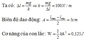Một vật nặng 200g treo vào lò xo làm nó giãn ra 2cm. Trong quá trình vật dao động điều hòa thì chiều dài của lò xo biến thiên từ 25cm đến 35cm. Lấy