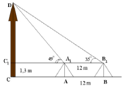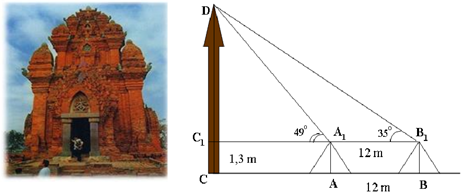 Muốn đo chiều cao của tháp chàm Por Klong Garai ở Ninh Thuận người ta lấy hai điểm \(A\) và \(B\) trên mặt đất có khoảng cách \(AB = 12\,{\rm{m}}\) cùng thẳng hàng với chân \(C\) của tháp để đặt hai giác kế. Chân của giác kế có chiều cao \(h = 1,3\,{\rm{m}}\). Gọi \(D\) là đỉnh tháp và hai điểm \({A_1}\), \({B_1}\) cùng thẳng hàng với \({C_1}\) thuộc chiều cao \(CD\) của tháp. Người ta đo được góc \(\angle D{A_1}{C_1} = 49^\circ \) và \(\angle D{B_1}{C_1} = 35^\circ \). Chiều cao \(CD\) của tháp là? (làm tròn đến hàng phần trăm)