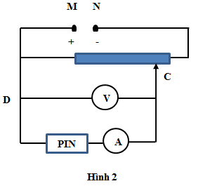 Nguồn điện hoá học một chiều (pin hoặc acquy) là thiết bị biến đổi hoá năng thành điện năng thông qua các phản ứng hoá học. Mỗi loại nguồn điện một chiều đều được đặc trưng bởi một loại phản ứng hoá học cụ thể, chính vì lẽ đó năng lượng mà nguồn biến đổi từ điện năng sang hoá năng (hoặc ngược lại) tỉ lệ thuận với lượng chất đã phản ứng trong nguồn. Vì lượng chất đã phản ứng tỉ lệ với số hạt mang điện mỗi loại được giải phóng trong nguồn (cũng là số hạt mang điện loại đó dịch chuyển qua nguồn điện) nên năng lượng mà nguồn giải phóng tỉ lệ với lượng chất đã phản ứng trong nguồn và tỉ lệ với điện lượng chuyển qua nguồn. Thực nghiệm cho thấy công suất toả nhiệt trong nguồn tỉ lệ với bình phương cường độ dòng điện chạy qua nó. Một học sinh mắc một pin vào mạch điện như hình 2, hiệu điện thế giữa hai điểm M và N không đổi theo thời gian. Vôn kế V đo hiệu điện thế giữa hai cực của pin. Cực dương của pin được nối vào D. Ampe kế A đo dòng điện chạy qua pin theo chiều từ pin đến A. Vôn kế có điện trở rất lớn còn Ampe kế và các dây nối có điện trở không đáng kể. Dịch chuyển con chạy C thì thấy rằng nếu V chỉ 5,00V thì A chỉ 1,30A, nếu V chỉ 4,5V thì A chỉ 800mA.