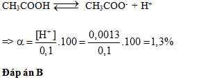 Nồng độ mol của ion H+ trong dung dịch CH3COOH 0,1M là 0,0013M. Độ điện li của axit CH3COOH là
