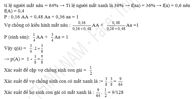 Ở người, gen A qui định mắt nâu trội hoàn toàn so với gen a qui định mắt xanh. Một quần thể đang cân bằng di truyền có 64% số người mắt nâu. Một cặp vợ chồng trong quần thể có kiểu hình mắt nâu. Xác suất để họ sinh con gái có mắt xanh là